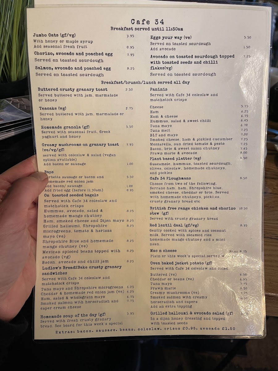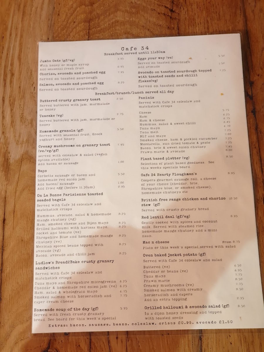 Welcome to Cafe 34, your go-to destination for a delightful culinary experience in Shrewsbury. Nestled at 34 Castle St, this charming cafe offers a diverse menu that caters to every palate. Start your day with delicious jumbo oats or savor the rich flavors of eggs your way. The standout items include the chorizo, avocado, and poached egg, as well as the fresh salmon and avocado options. For lunch, indulge in a variety of sandwiches such as tuna mayo or the highly recommended halloumi bagel, praised by customers for its fantastic taste and value.